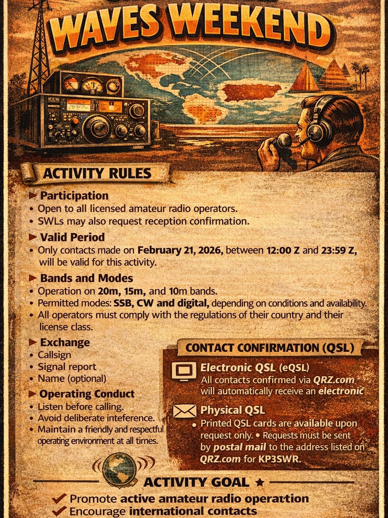• Only contacts made on February 21, 2026, between 12:00 Z and 23:59 Z, will be valid for this activity.